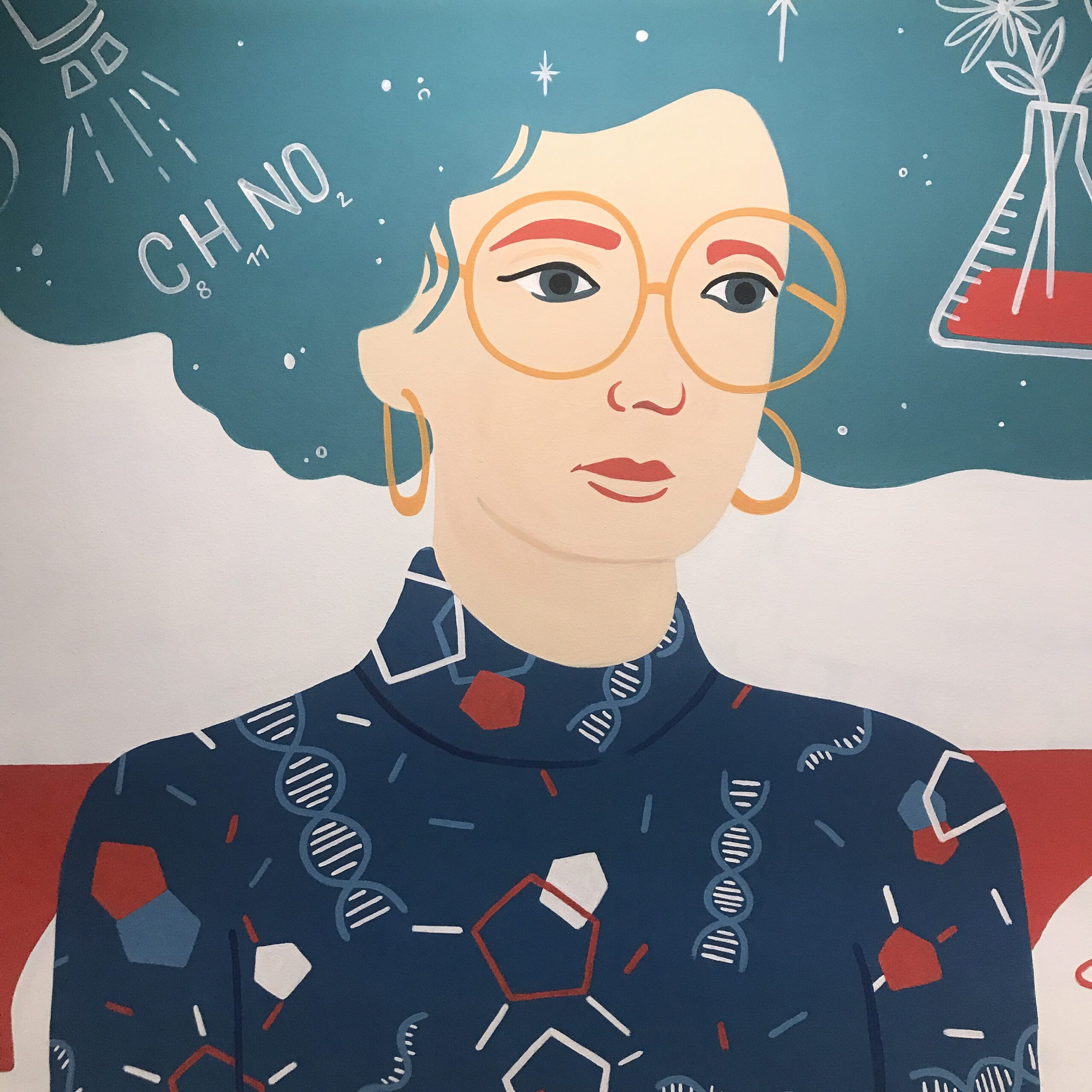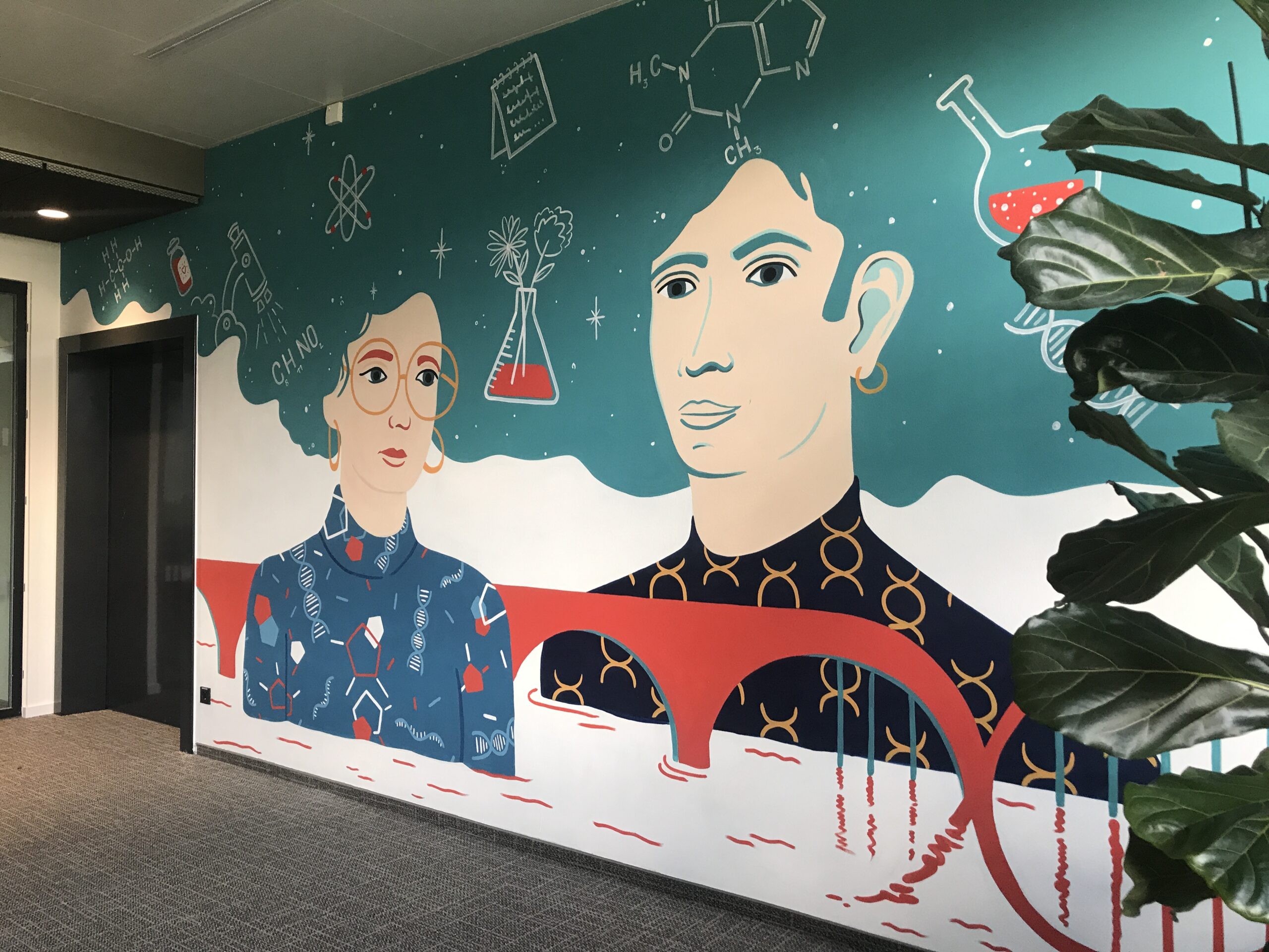 Dans les locaux de BioLabs à Heidelberg, une fresque murale signée par l’artiste Céleste Gangolphe vient habiller l’un des murs du site. Cette création propose un dialogue subtil entre science et art, en résonance directe avec l’identité du lieu.