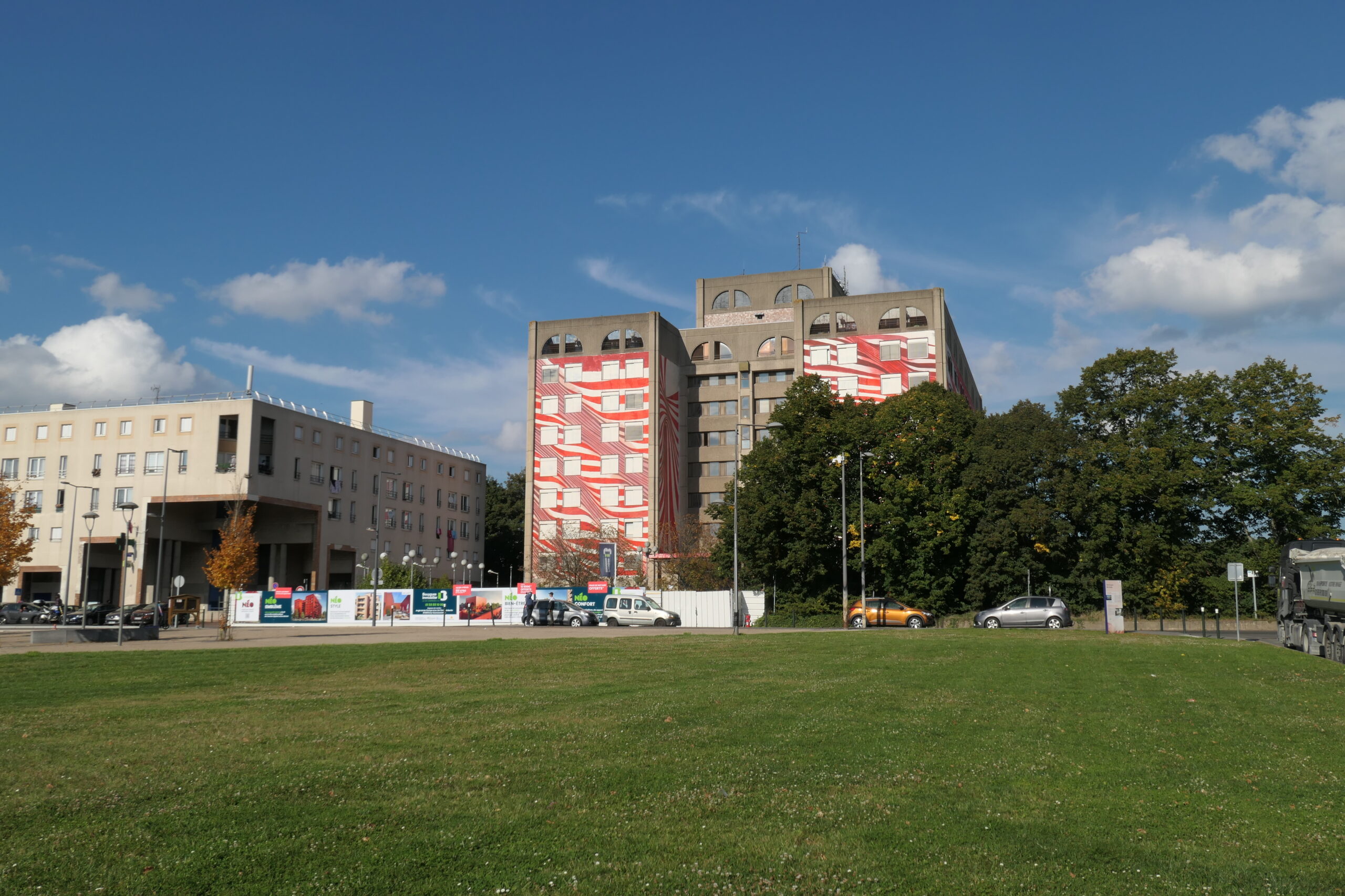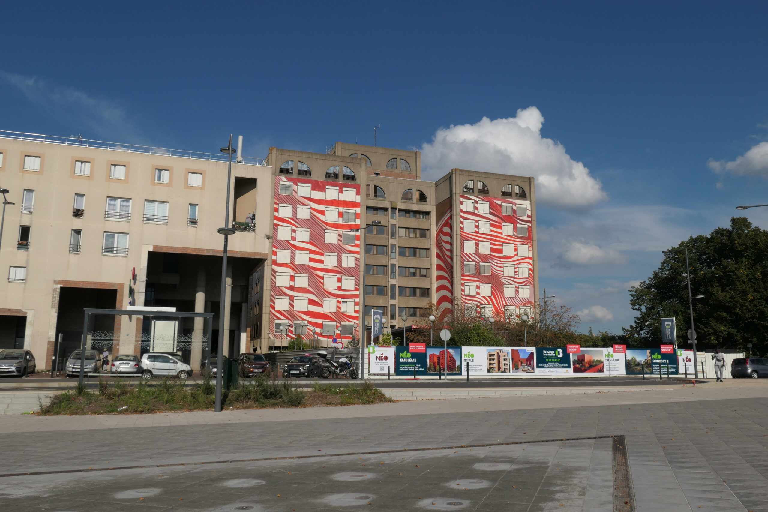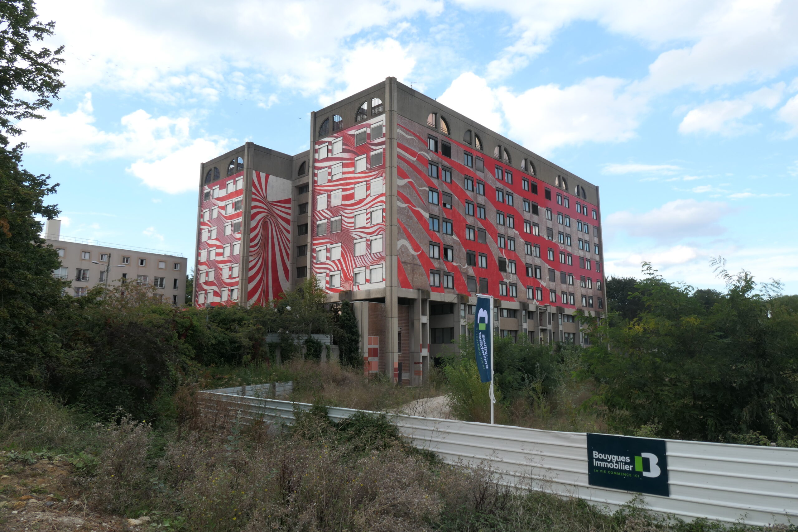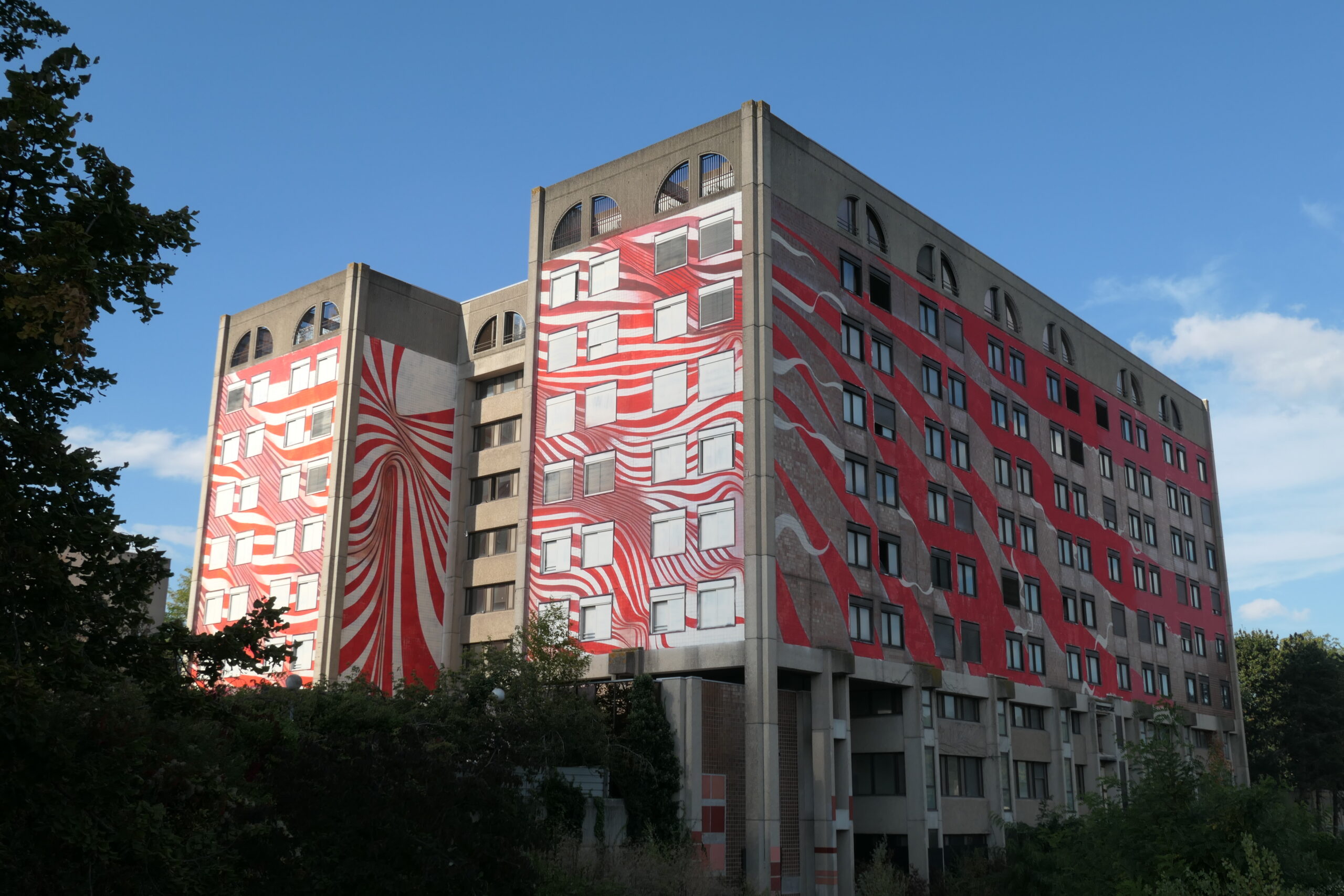 L’œuvre murale de Matthieu Dagorn sur la Tour H de l’ancien Hôpital Louise Michel à Évry-Courcouronnes, incarne le mouvement et la transformation. Composée de lignes courbées qui enveloppent une partie de la structure, elle crée une illusion d’optique qui fait vibrer le bâtiment sous l’effet de vagues mouvantes. Ces lignes, dynamiques et fluides, évoquent le changement, soulignant la transition de cette ancienne infrastructure vers un avenir nouveau.