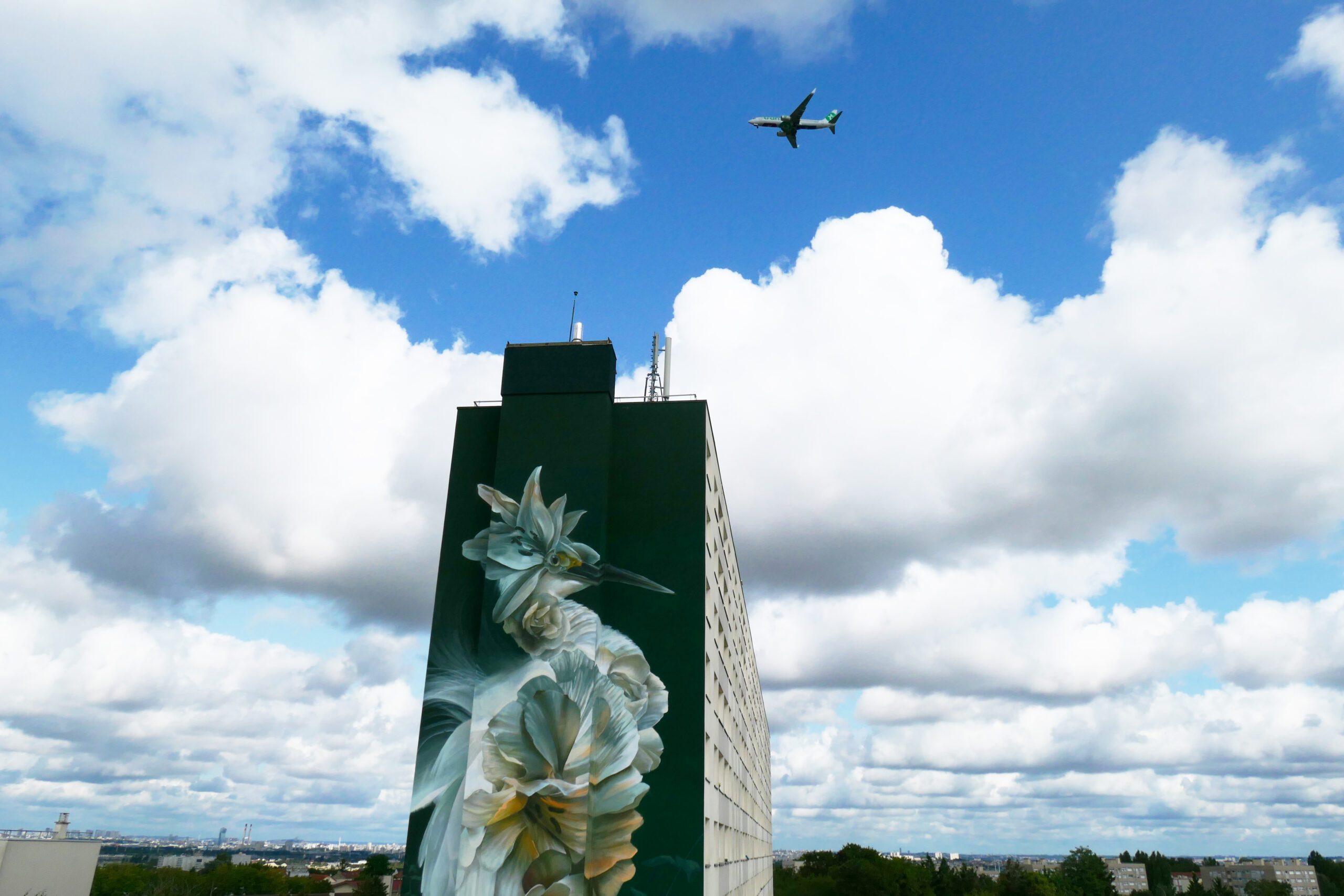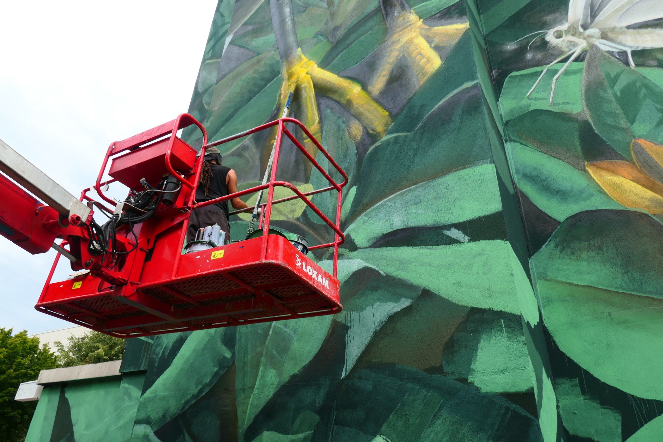 Une fresque murale monumentale de 33 mètres de hauteur signée par l’artiste Curtis Hylton déploie toute sa force visuelle au cœur de l’espace urbain. L’œuvre représente un héron blanc se détachant sur un fond végétal luxuriant.