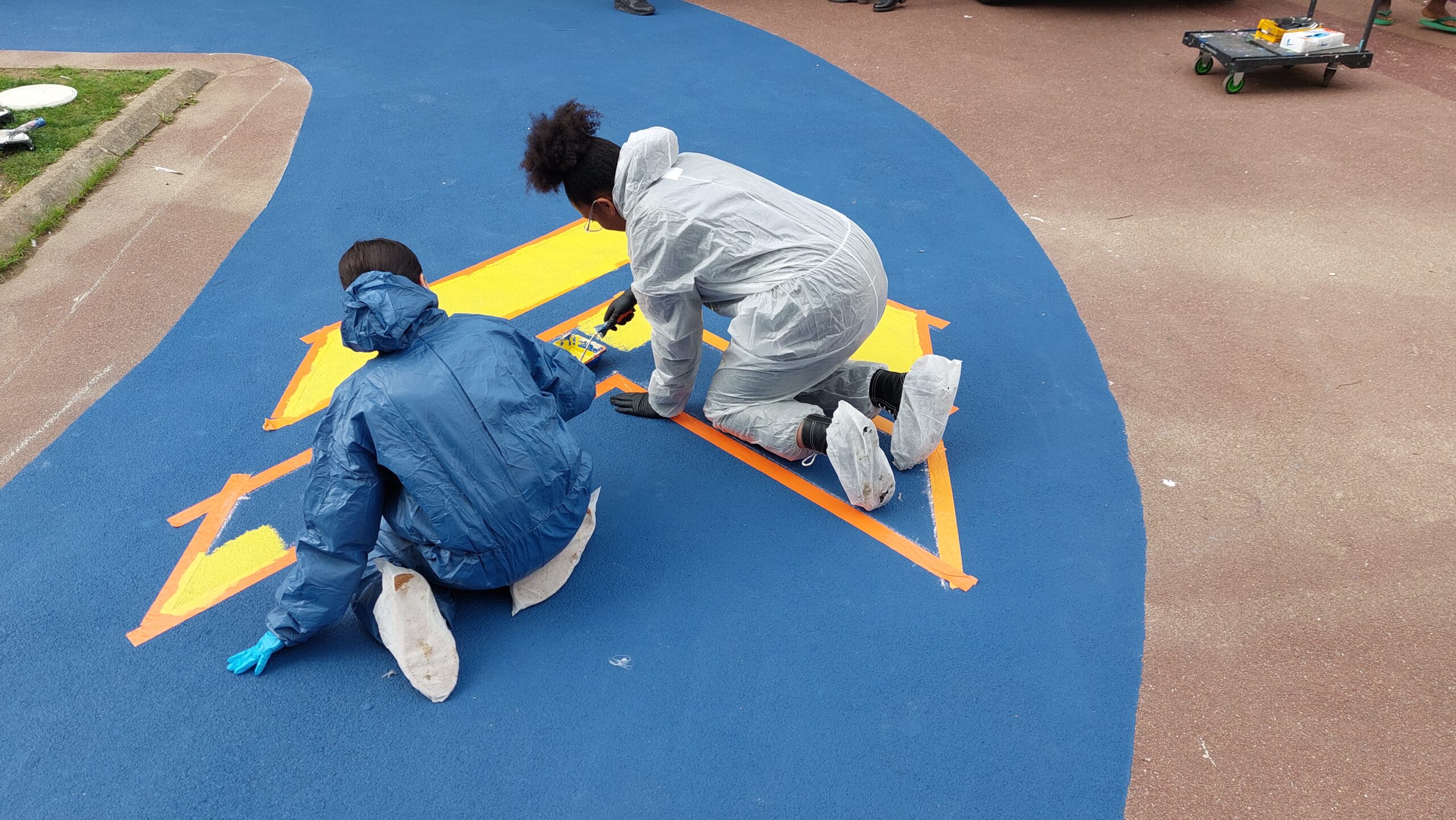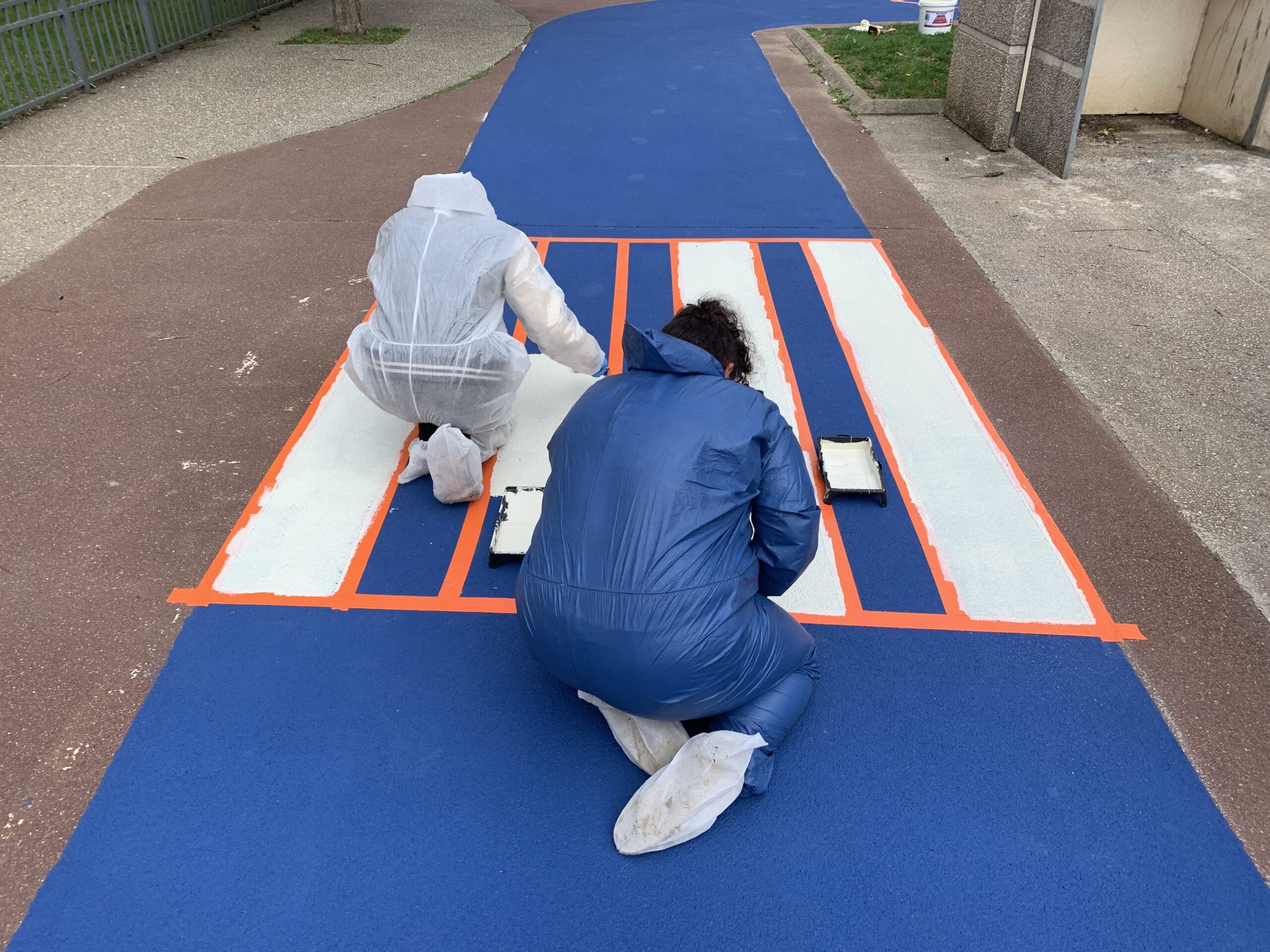 Dans la continuité de cette démarche, l’Agence GLV est intervenue à nouveau au sein de la résidence pour la réalisation peinte d’un circuit vélo au sol. Ce chantier a été conçu comme un temps à la fois formateur et valorisant, avec l’encadrement de cinq jeunes accompagnés par l’ACVER, association œuvrant à la réintégration scolaire de collégiens et lycéens. Cette expérience collective a permis de conjuguer apprentissage, responsabilisation et contribution concrète à l’amélioration du cadre de vie.