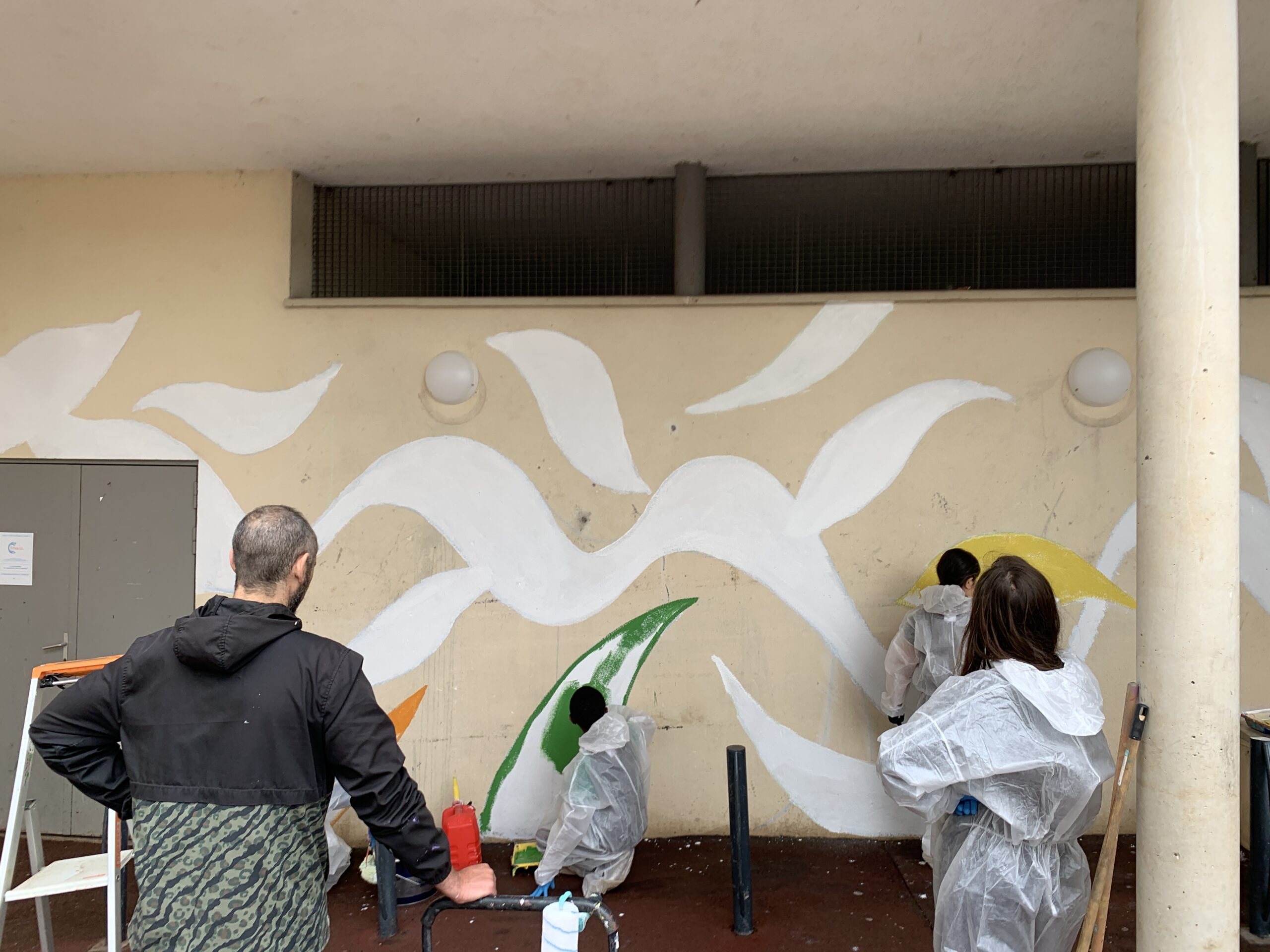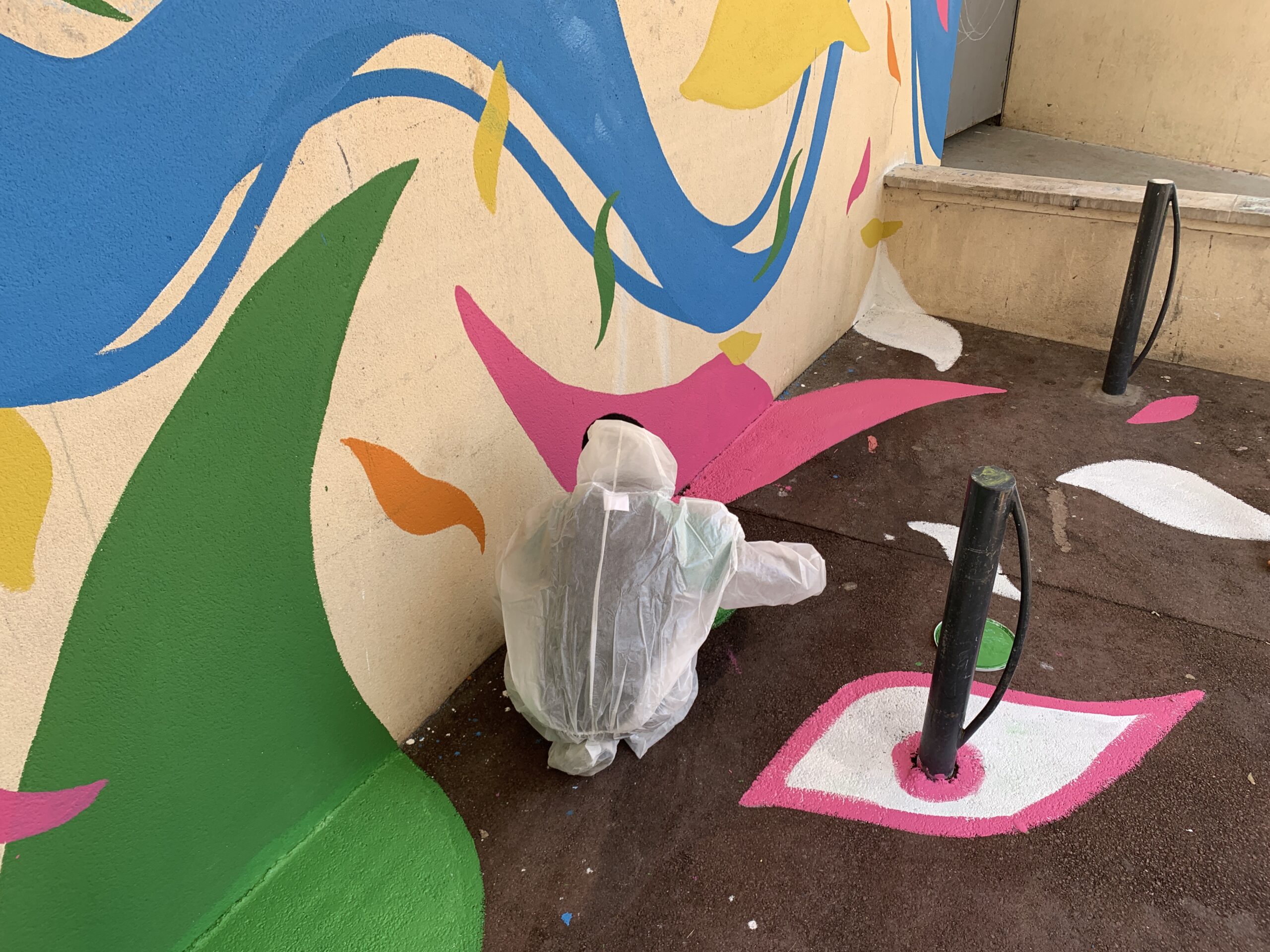En amont de la réalisation de l’œuvre de l’artiste Stew, un atelier participatif a été mené autour de la création d’une fresque abstraite, déployée à la fois sur un mur et au sol de la résidence. Ce temps de création collective a permis d’établir une première prise de contact essentielle avec les habitants, et plus particulièrement avec les jeunes du site. L’atelier a constitué un moment clé pour instaurer un climat de confiance, favoriser l’expression et poser les bases d’un projet artistique partagé.