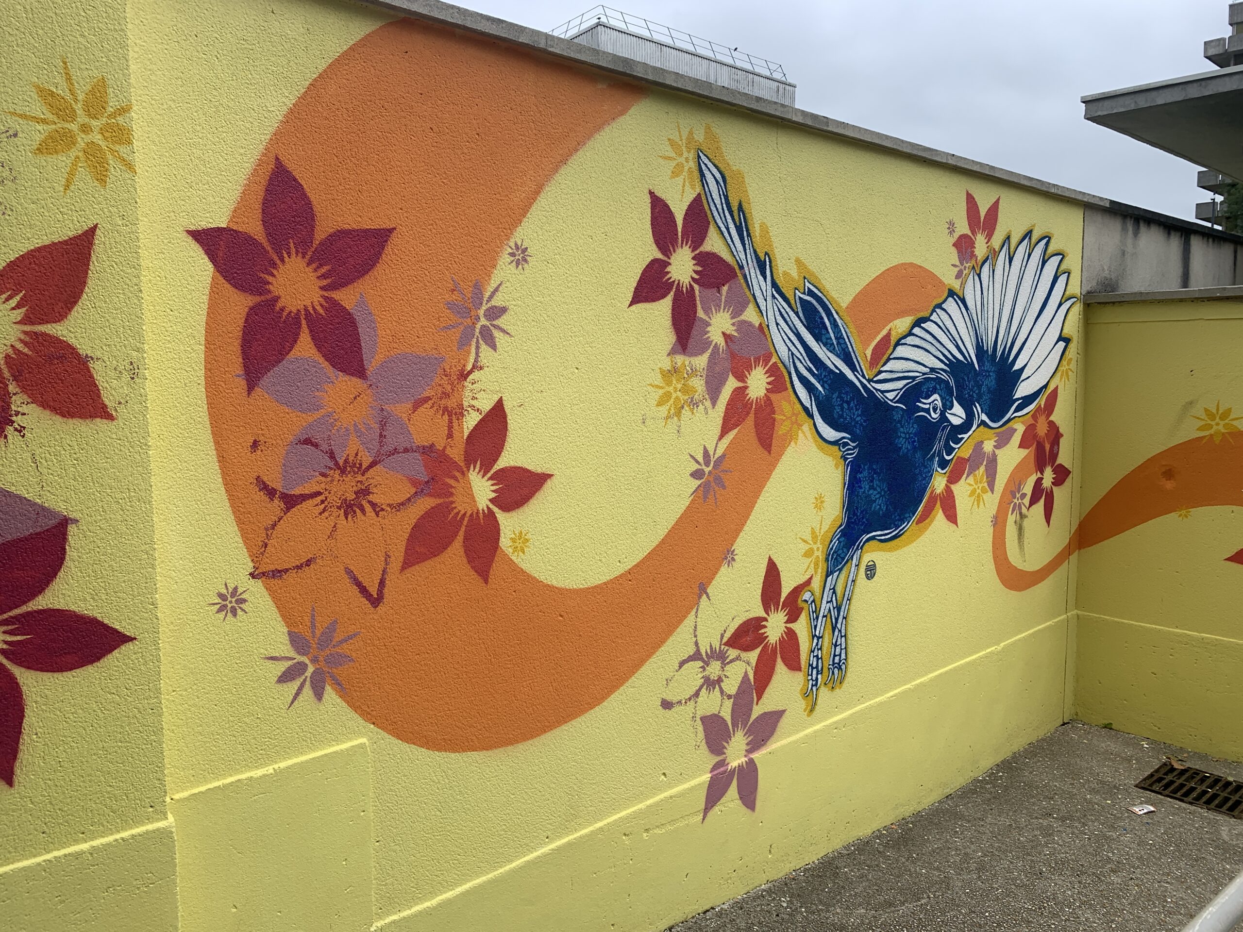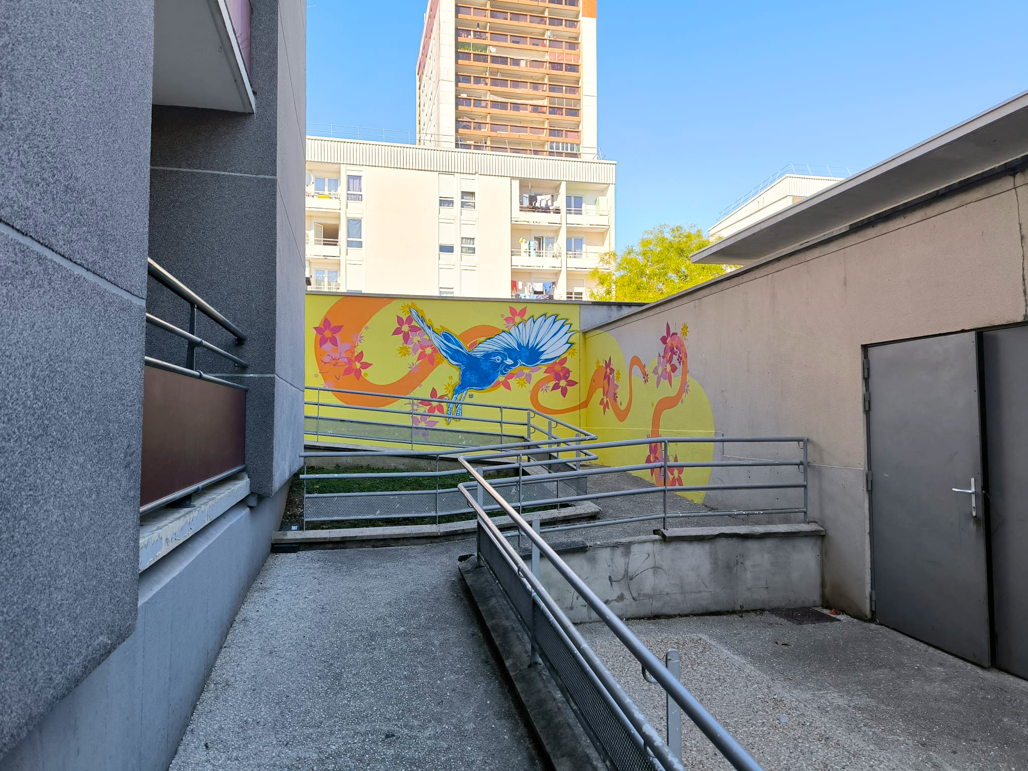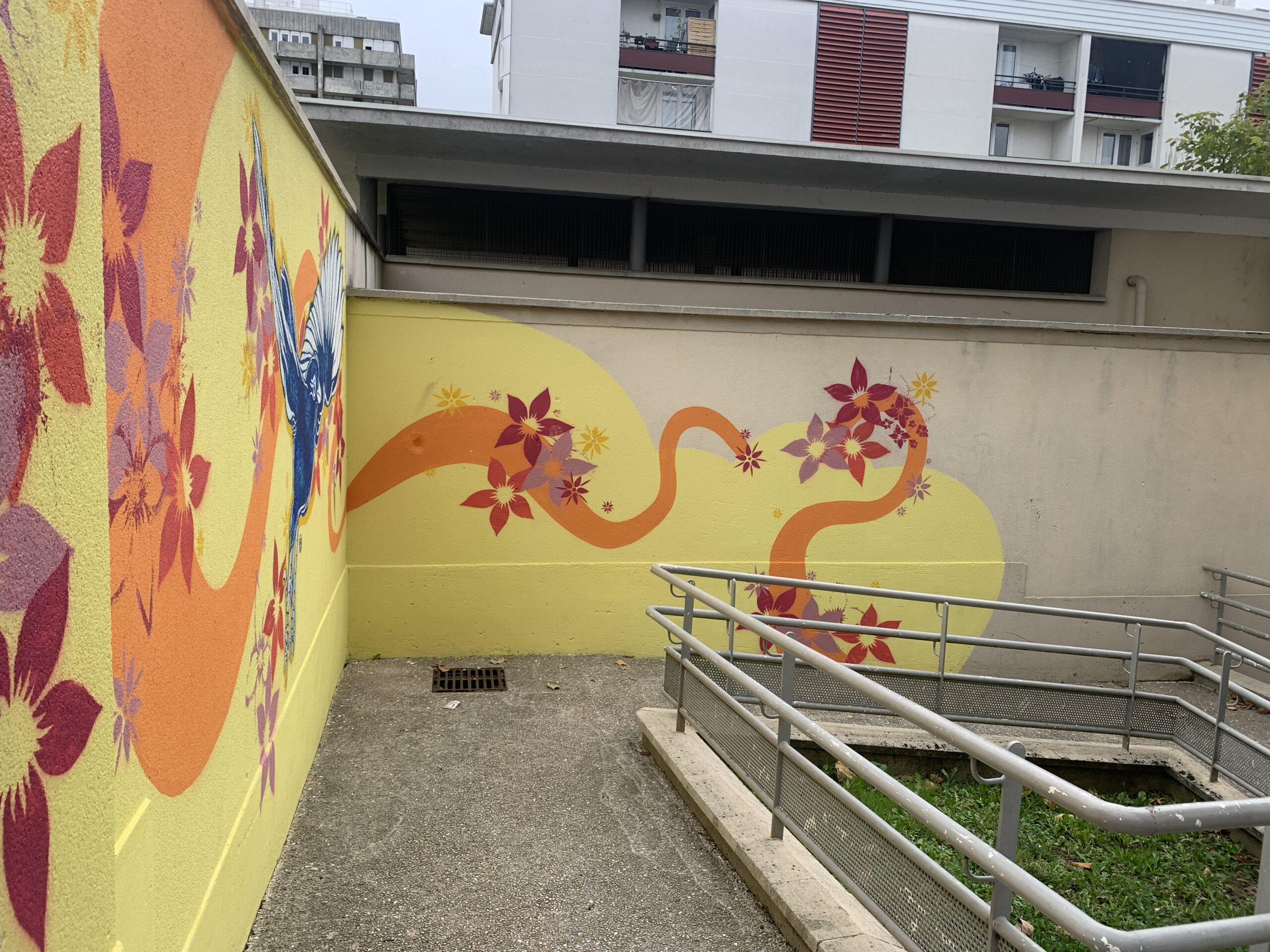Déployée le long de la rampe d’accès PMR, l’œuvre accompagne avec poésie le cheminement des usagers, transformant un simple lieu de passage en un lieu chaleureux et accueillant. Par son traitement graphique épuré et ses tonalités ensoleillées, la fresque apporte une respiration artistique au bâtiment tout en valorisant son accessibilité.