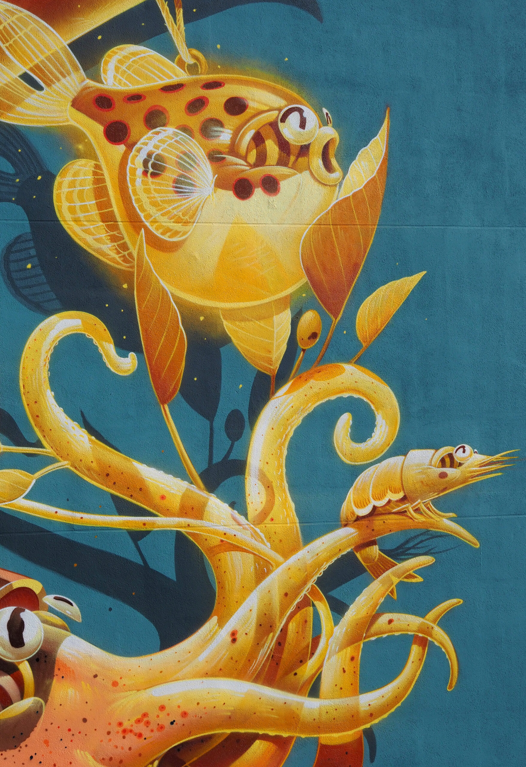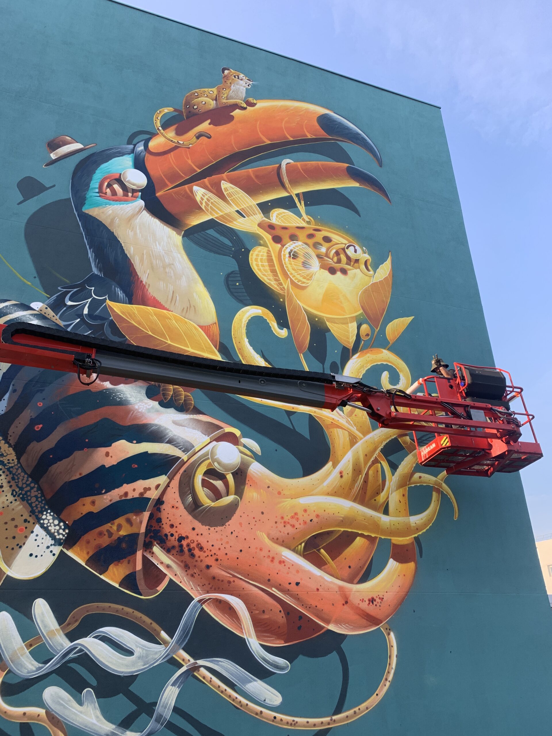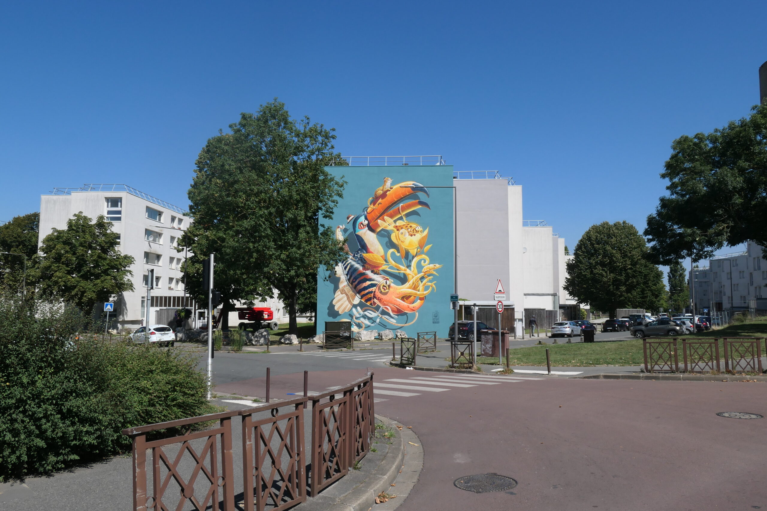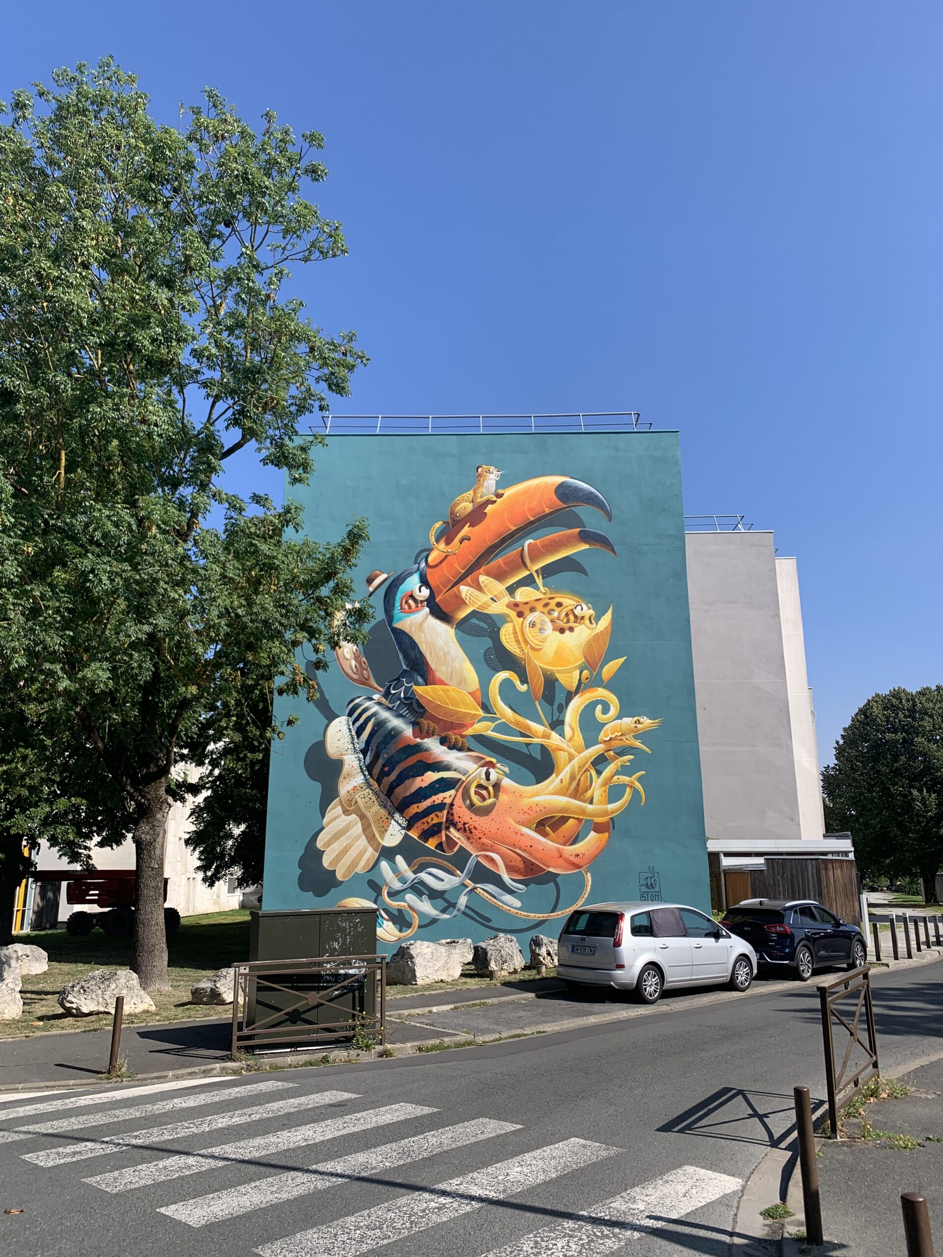 Pour cette édition, l’artiste Stom500, reconnu pour son univers graphique mêlant humour, couleurs éclatantes et animaux cartoonesques, a été invité. Son travail, à la fois ludique et percutant, dialogue avec l’architecture du quartier et offre une lecture accessible et joyeuse de l’art urbain.