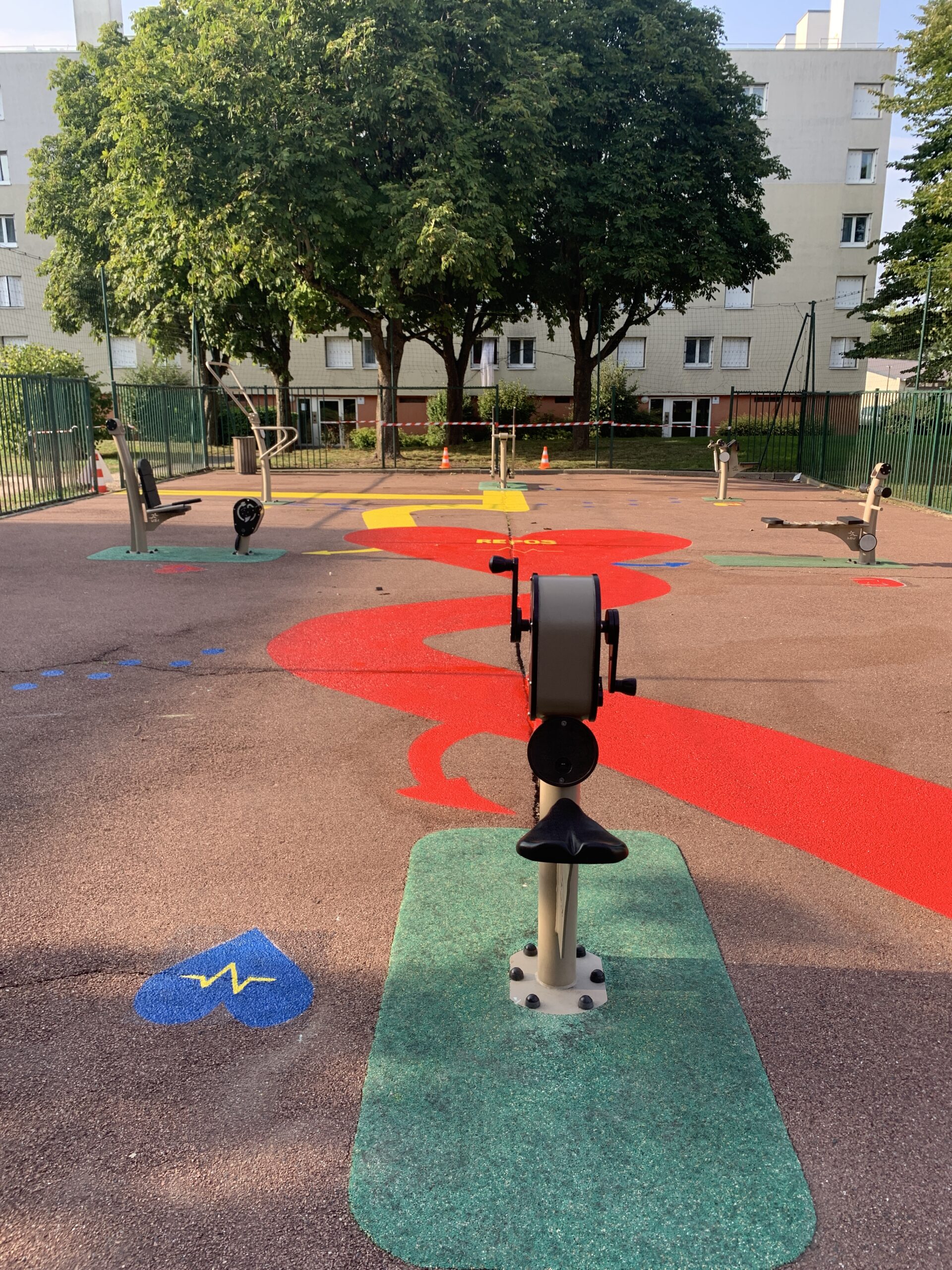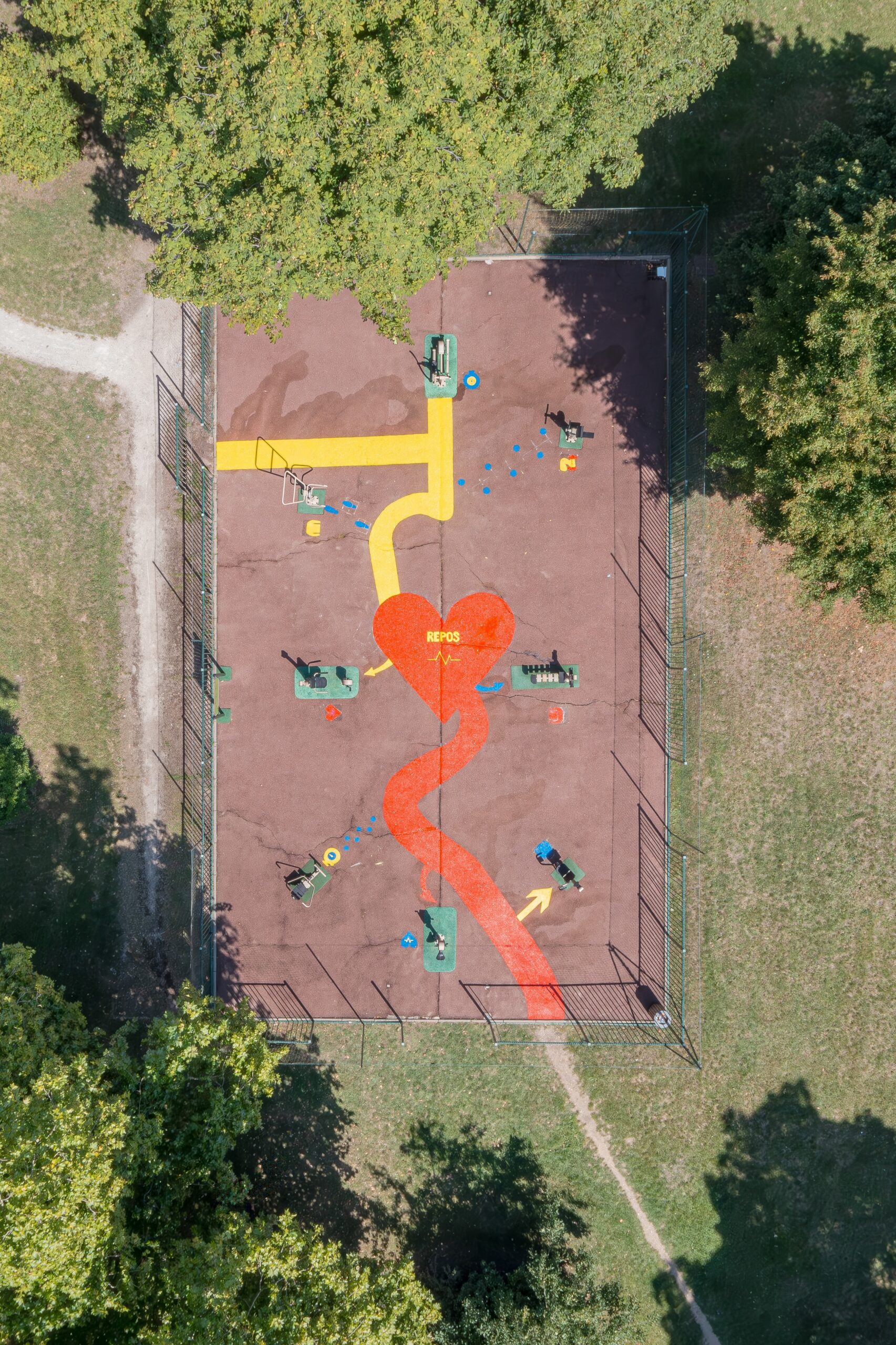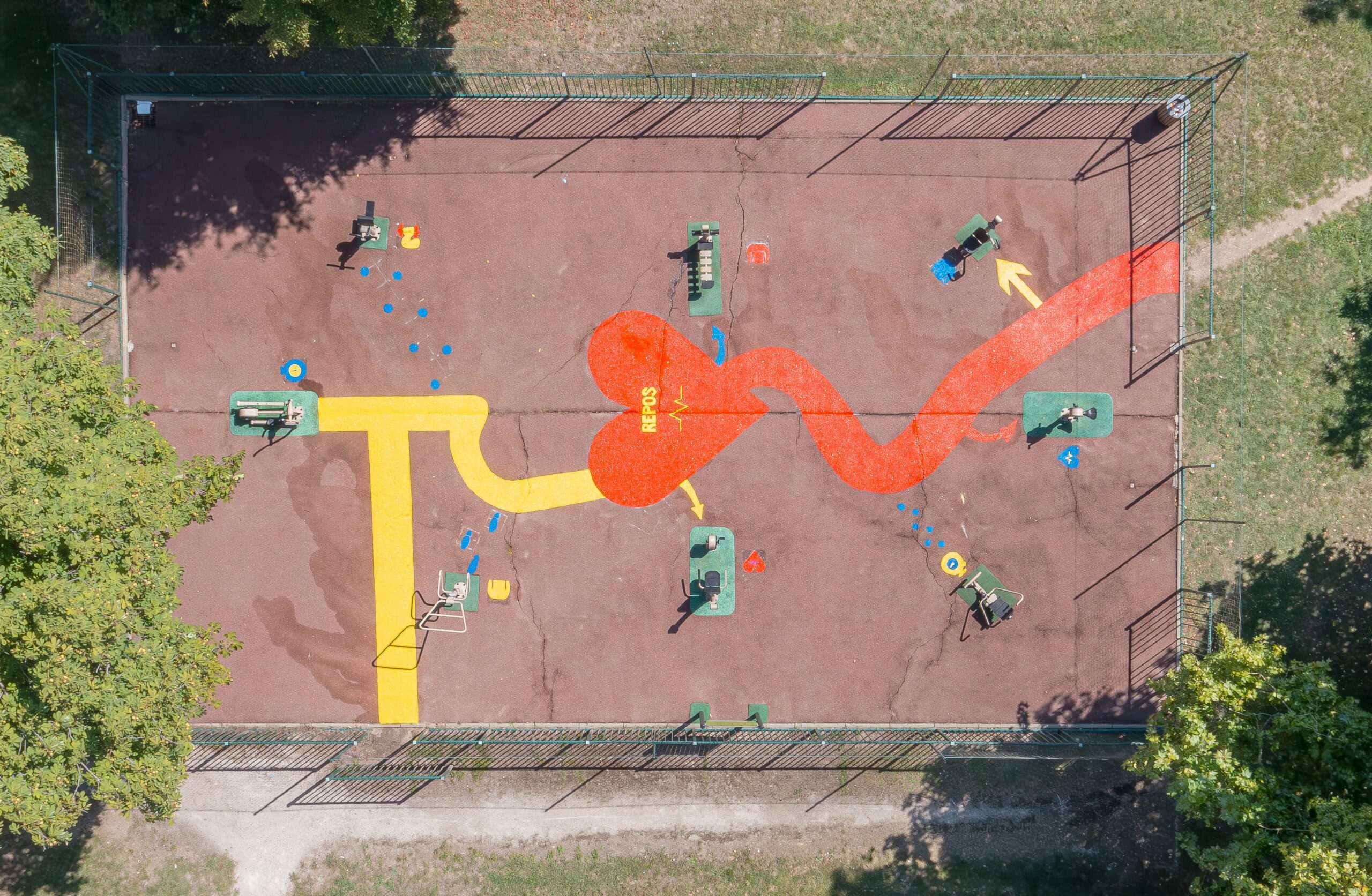 Pensé comme un outil d’aménagement à la fois fonctionnel et pédagogique, ce dispositif graphique permet de structurer clairement l’espace sportif tout en rendant les usages immédiatement lisibles. Les tracés au sol représentent des pictos symbolisant les différentes pratiques en fonction des machines utilisées.