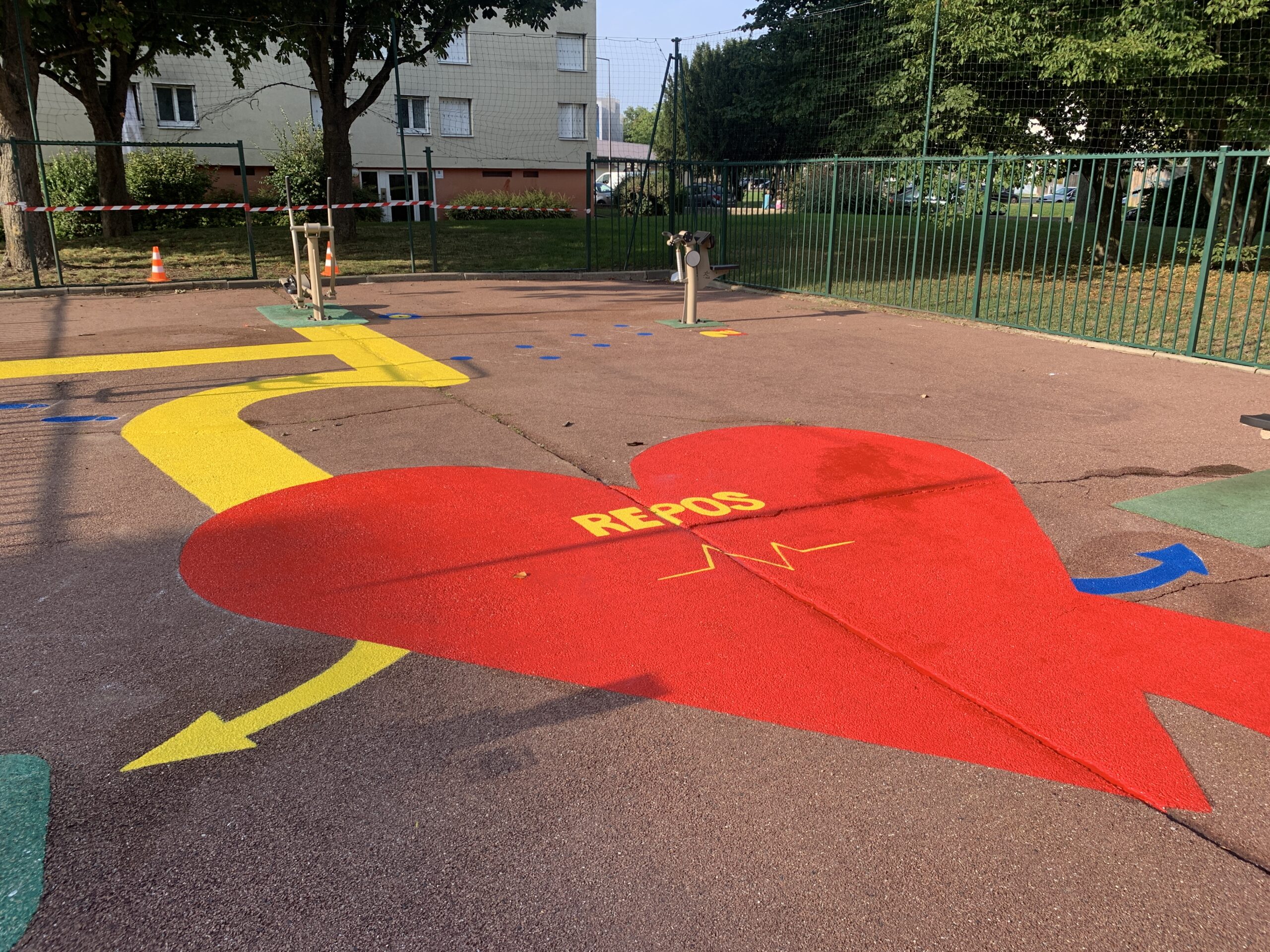 Réalisation d’une peinture au sol de type design actif destinée à matérialiser des installations sportives sur une aire dédiée, pour le compte de Valophis Habitat, à Villeneuve-Saint-Georges.